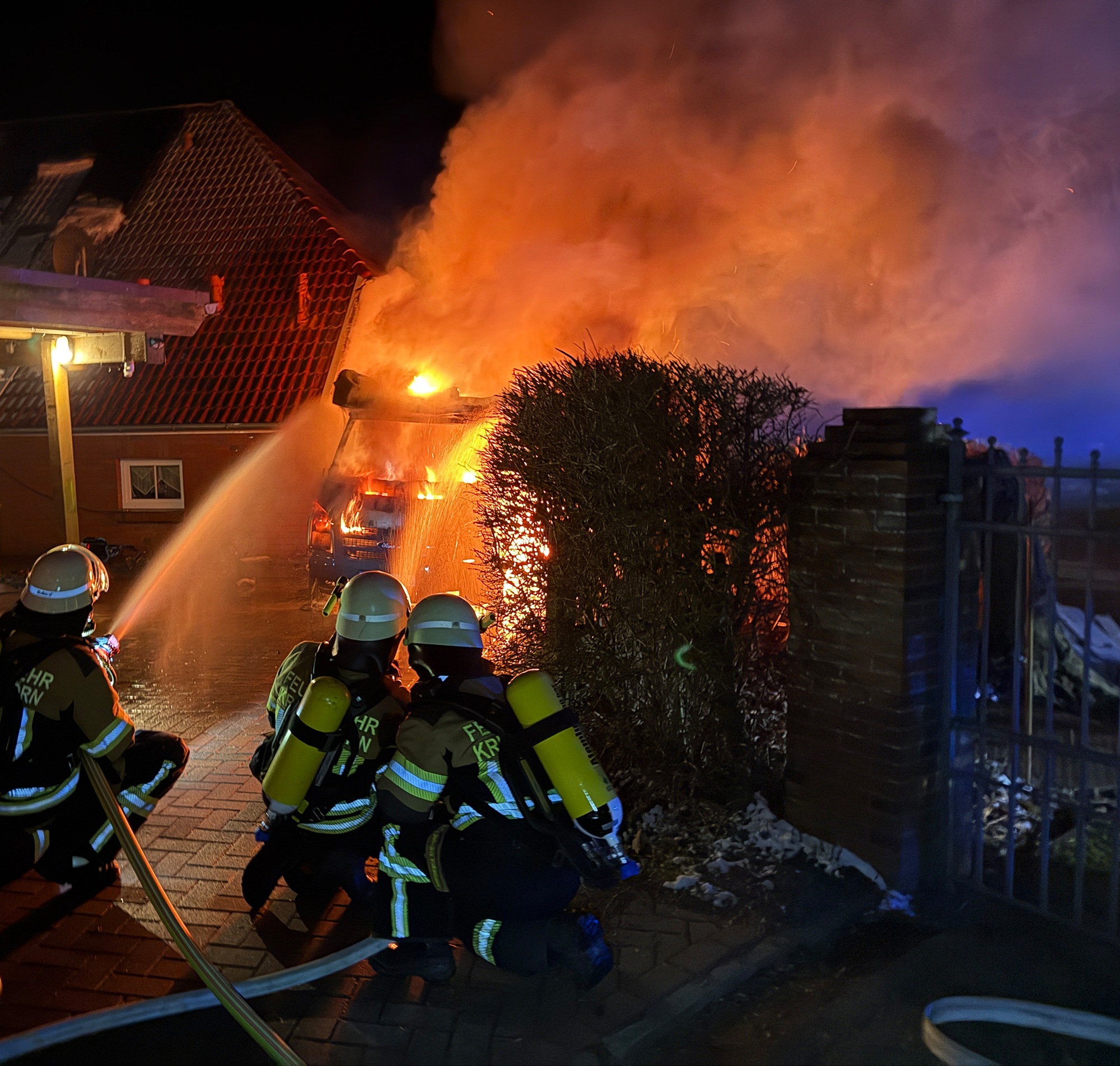 Mehrere Trupps unter Atemschutz bekämpften den Brand und konnten ein Übergreifen auf das Wohnhaus verhindern.