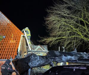 Durch die starke Hitzeentwicklung wurden Teile des Daches und ein Fenster in Mitleidenschaft gezogen. Zur Kontrolle auf mögliche Glutnester öffneten die Einsatzkräfte Bereiche der Dacheindeckung am Ortgang und überprüften diese mit einer Wärmebildkamera.