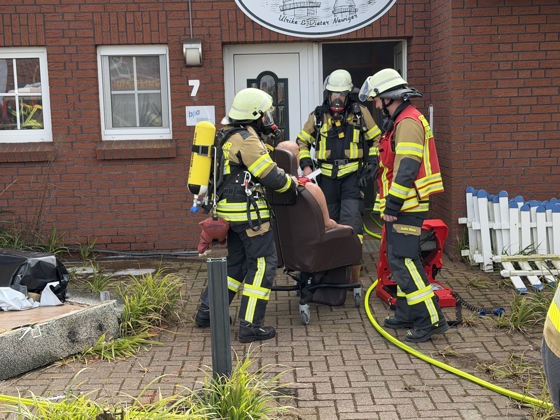Dem Übungsszenario zufolge befanden sich noch zwei Personen im Gebäude, die unter Atemschutz gerettet werden mussten. Insgesamt drei Trupps durchkämmten das weitläufige und verwinkelte Objekt. Besonders herausfordernd waren die zahlreichen Zimmer bei Nullsicht.