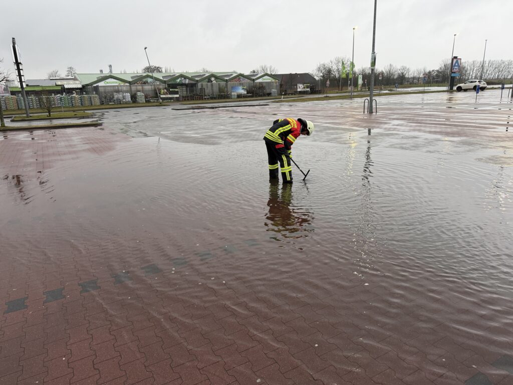 Ein Teil des Parkplatzes sowie der Lagerbereich des Verbrauchermarktes standen großflächig mehrere Zentimeter hoch unter Wasser, da die Abläufe das angefallene Regenwasser nicht ableiteten.