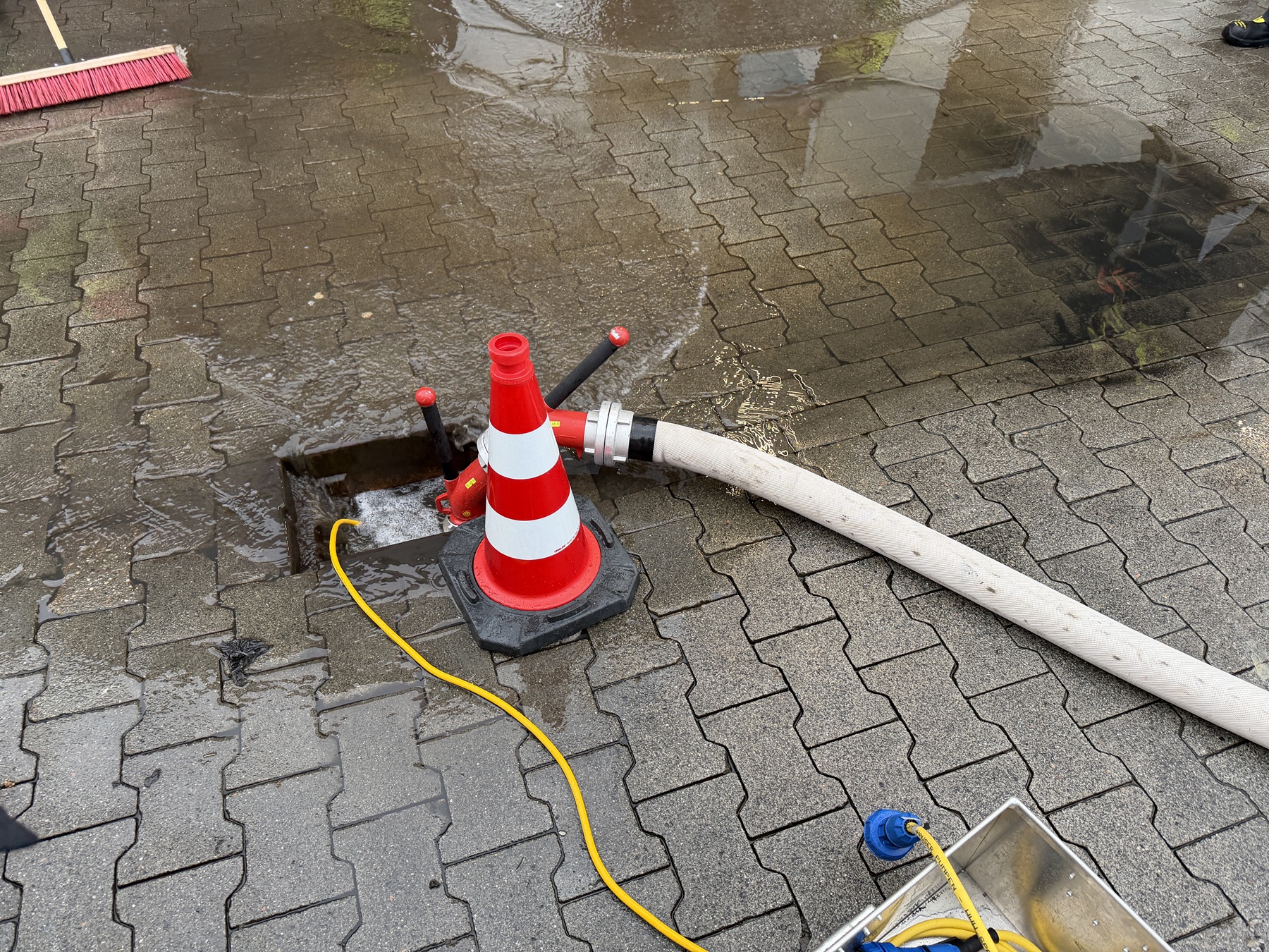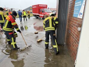 Die Einsatzkräfte unterstützten das Marktpersonal im Innenbereich mit Wasserschiebern und pumpten das Wasser mithilfe einer Tauchpumpe in einen nahegelegenen Graben.